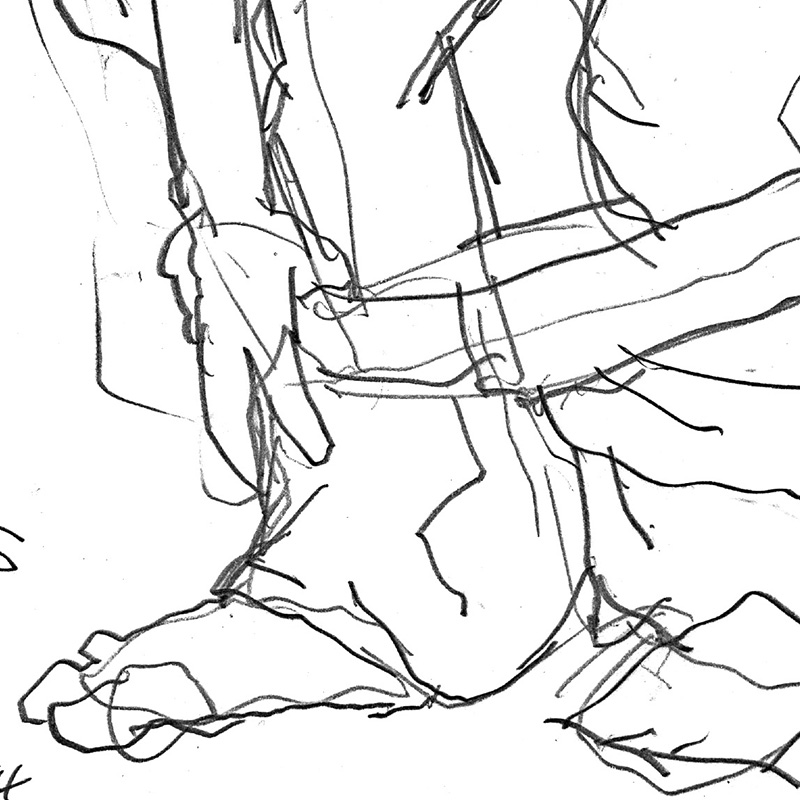 Preparatory sketch for painting: young part-Hawaiian male taking off his shorts.