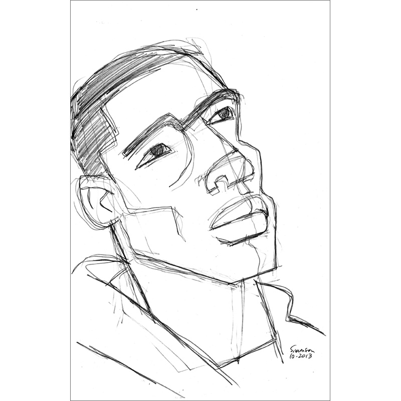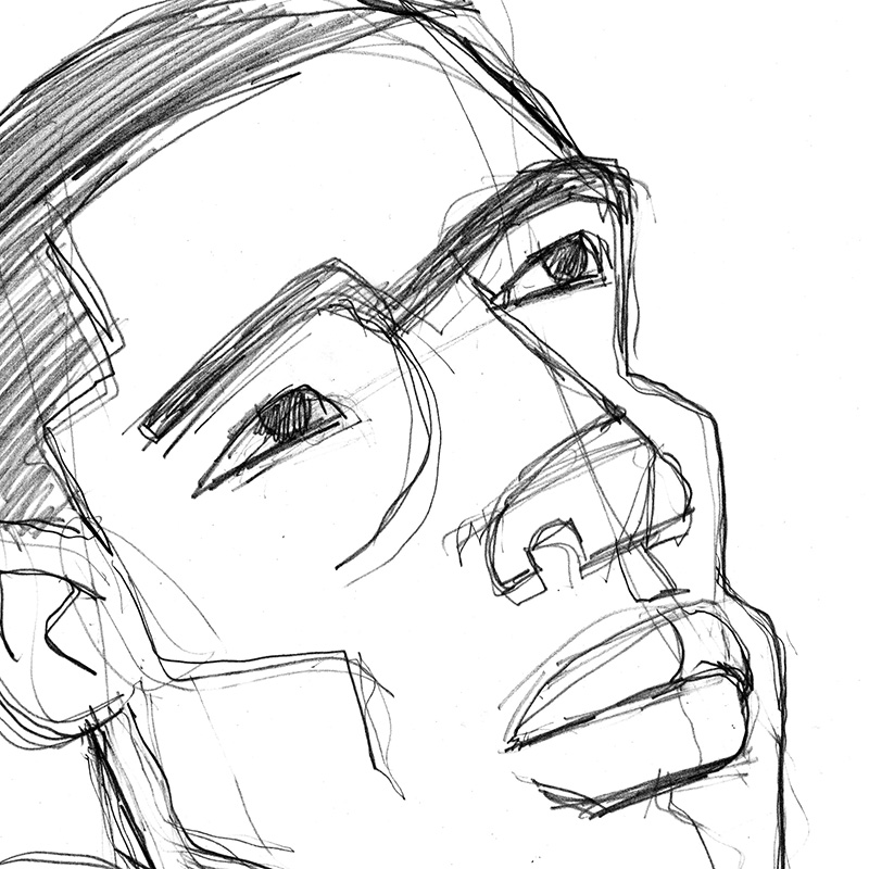 Young man with heavy eyebrows looking upward.
