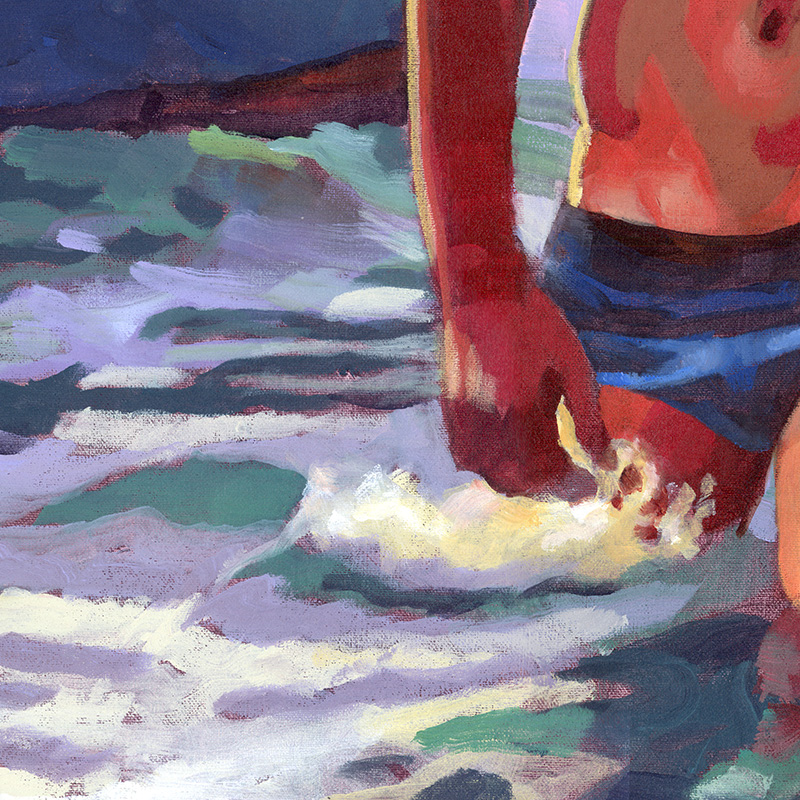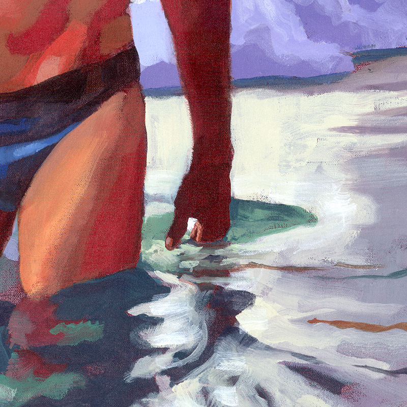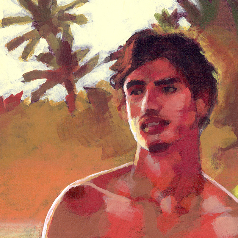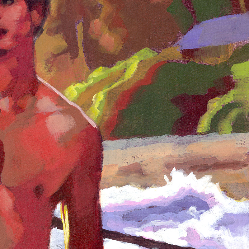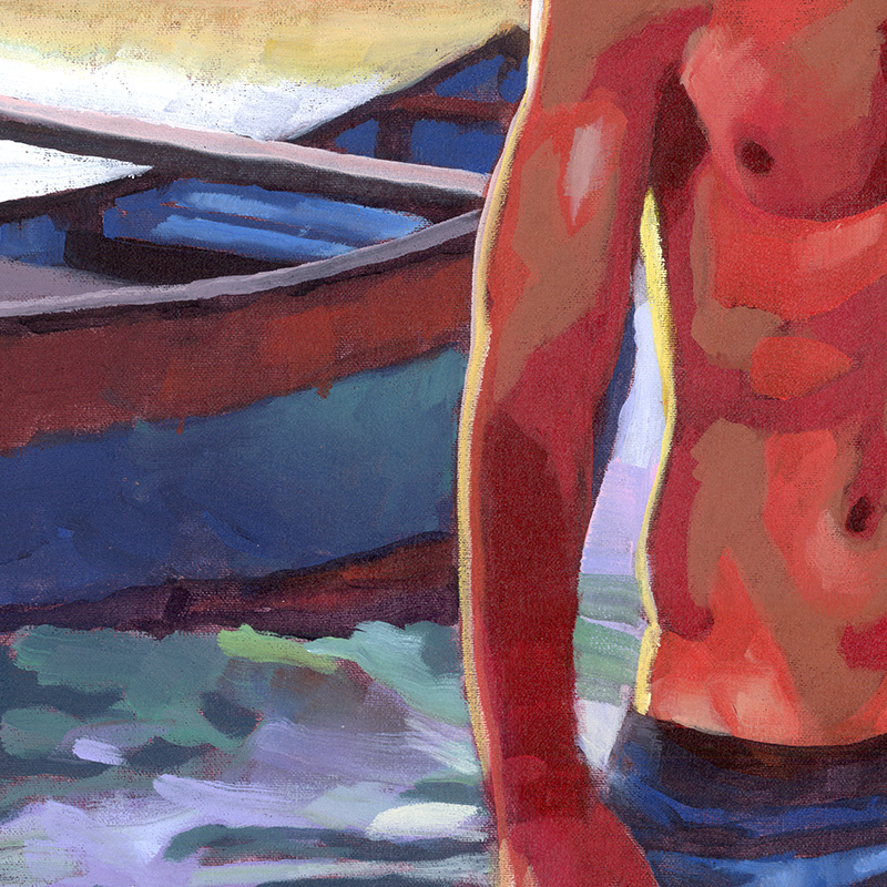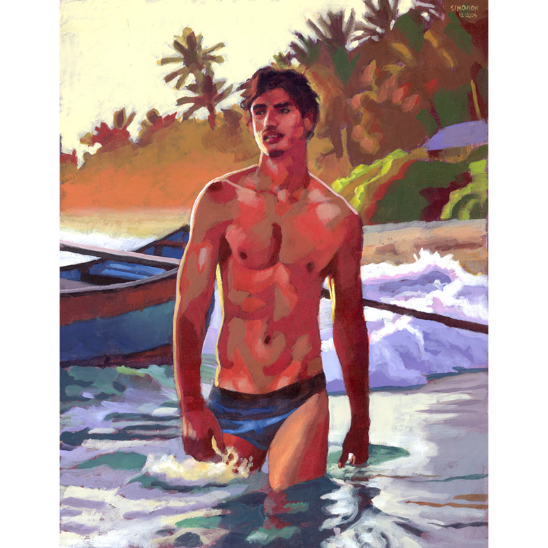 Handsome young Latin guy in swimsuit walks in tropical surf near boat.