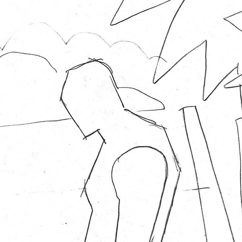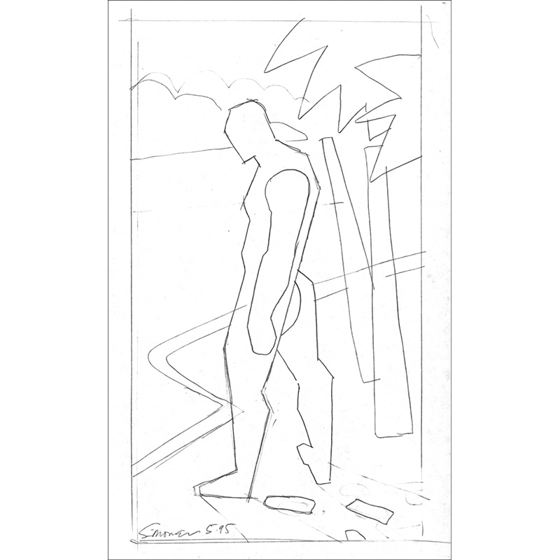 Stylized male figure standing by palm trees.