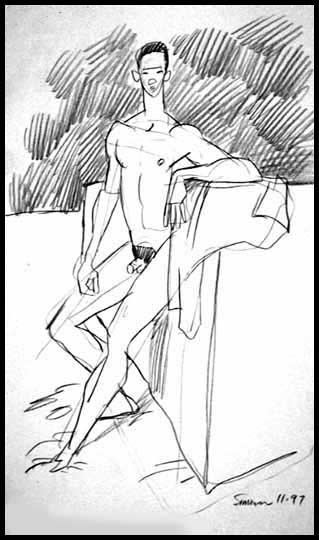 Stylized full-length frontal nude, boy at beach