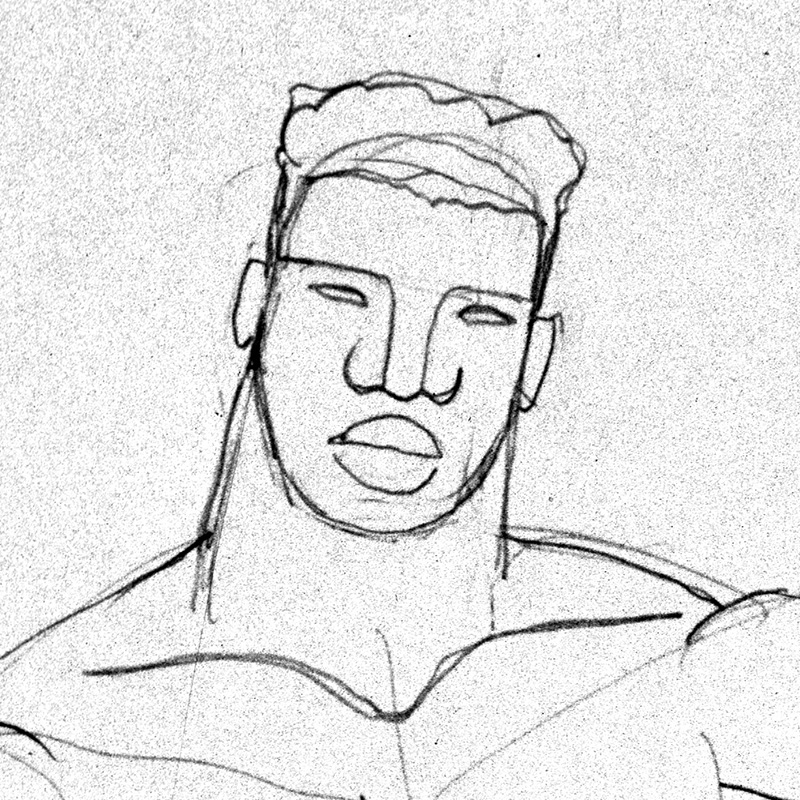 Muscular male, stylized, frontal nude.