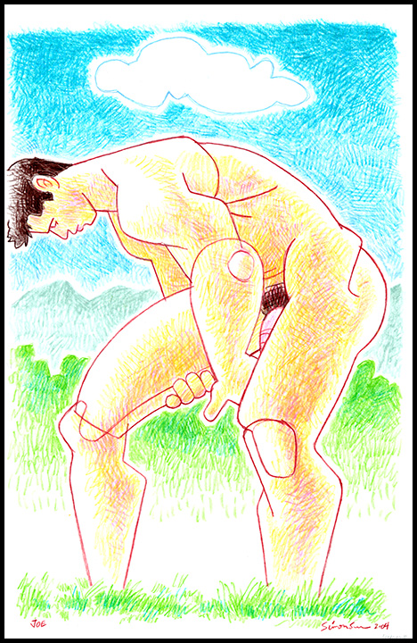 Stylized nude bending over to put sunblock on leg