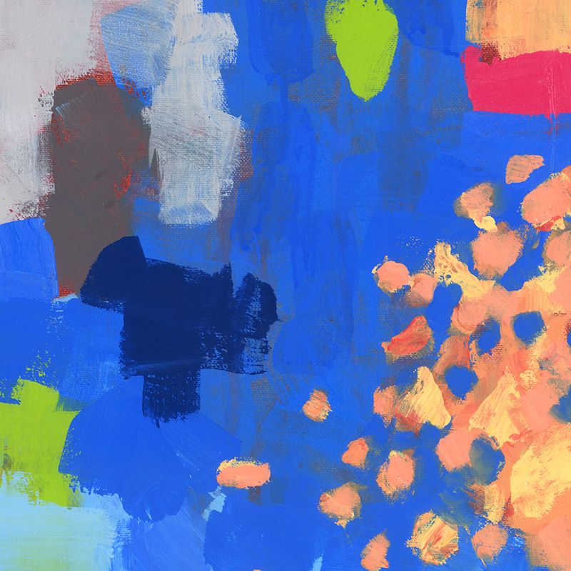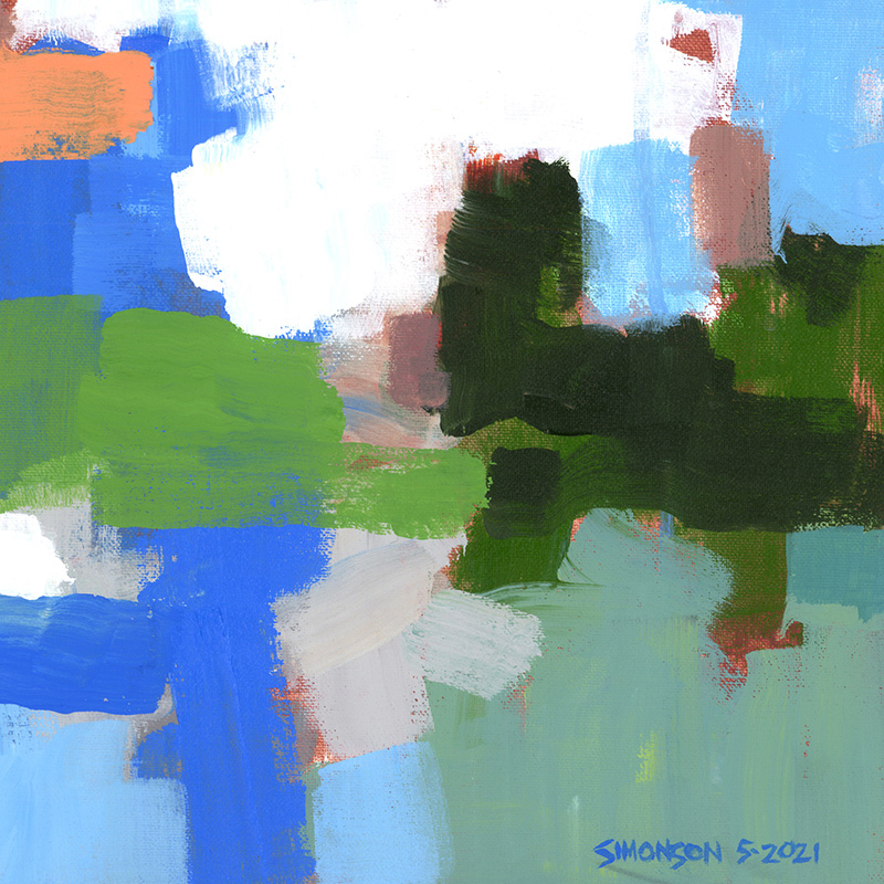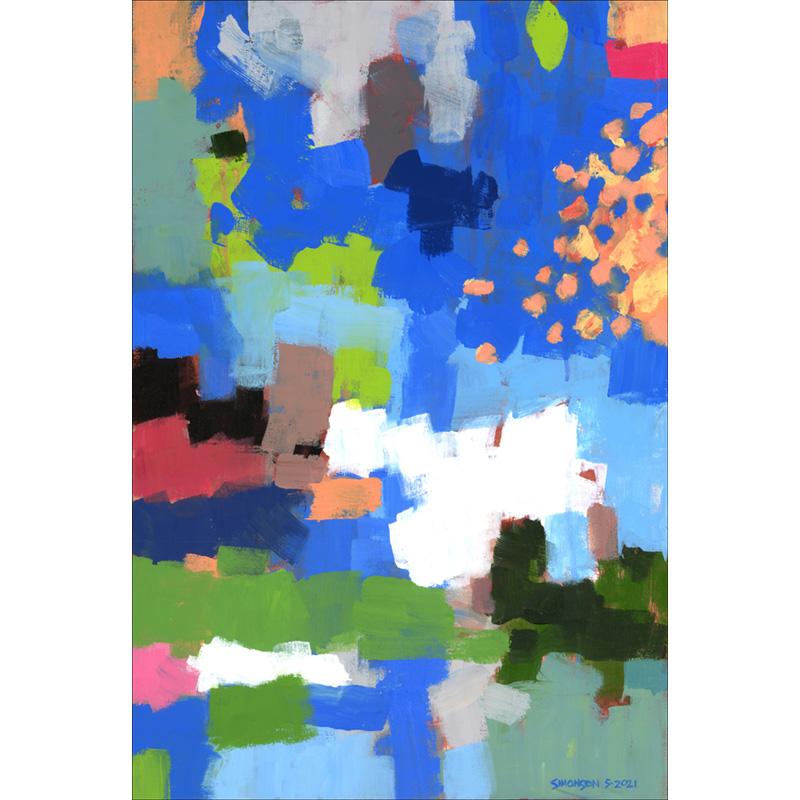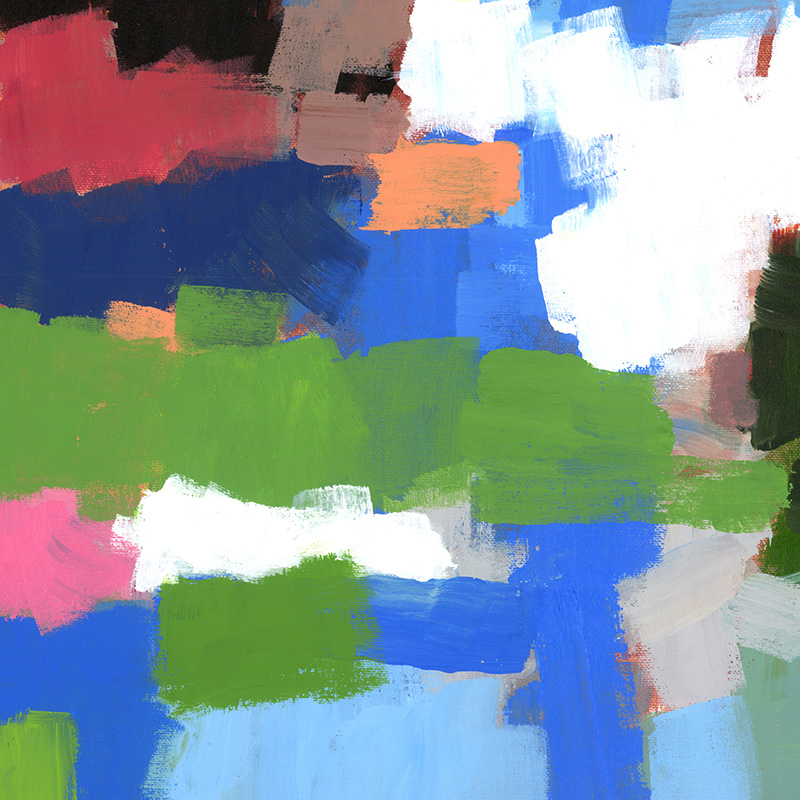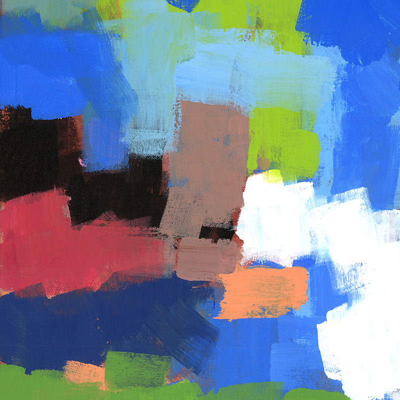Cheerful abstract with blues, whites, greens, oranges.