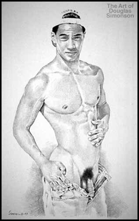 Frontal nude, Asian male squinting into sun