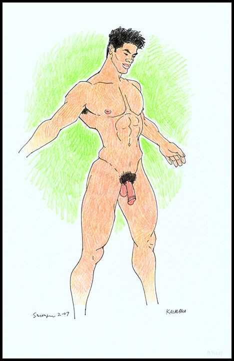 Muscular Hawaiian male nude with arms spread