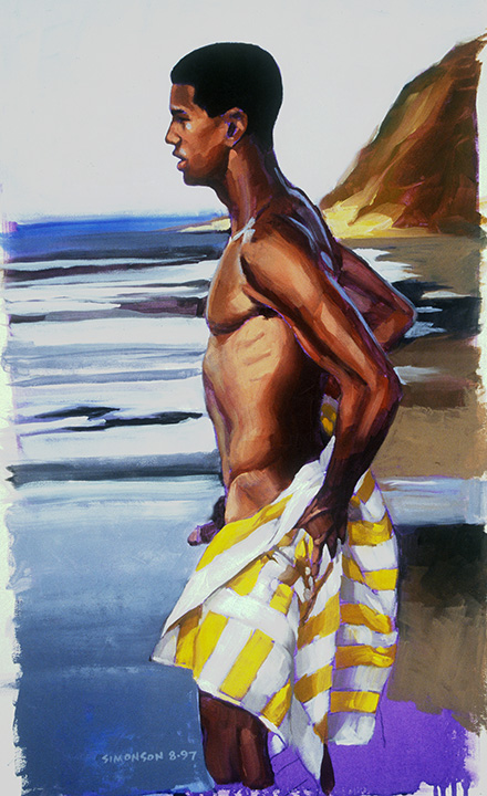 Avery nude at Diamond Head Beach, toweling off in early-morning light