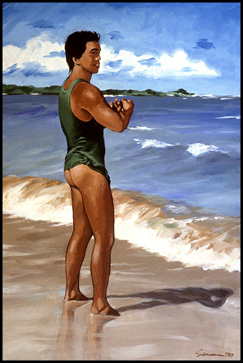 Chinese-Hawaiian male poses at an Oahu beach in just a wet tanktop