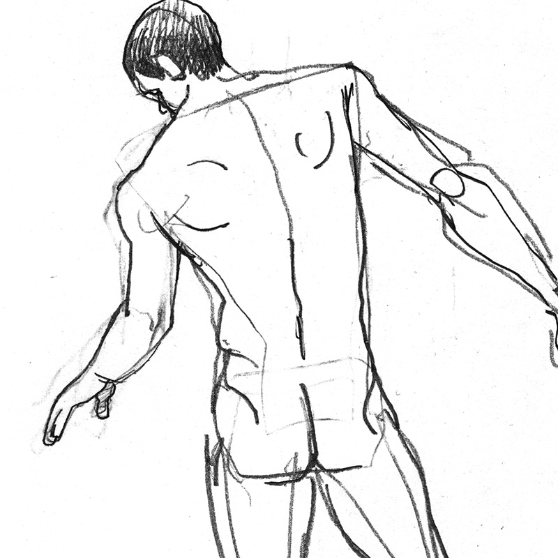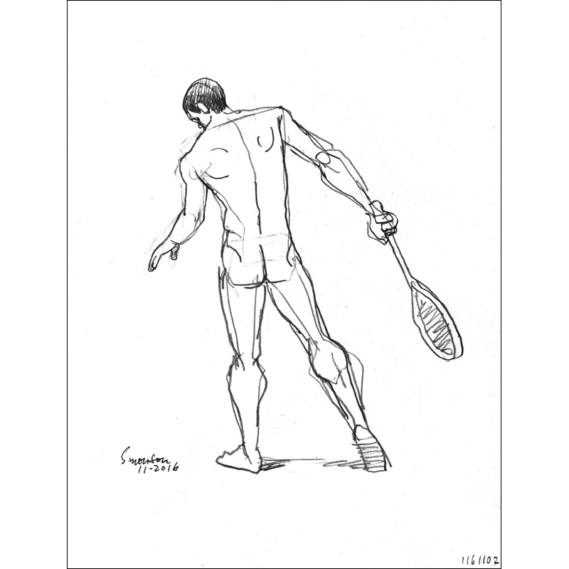 Standing rear nude of tennis player holding racquet.