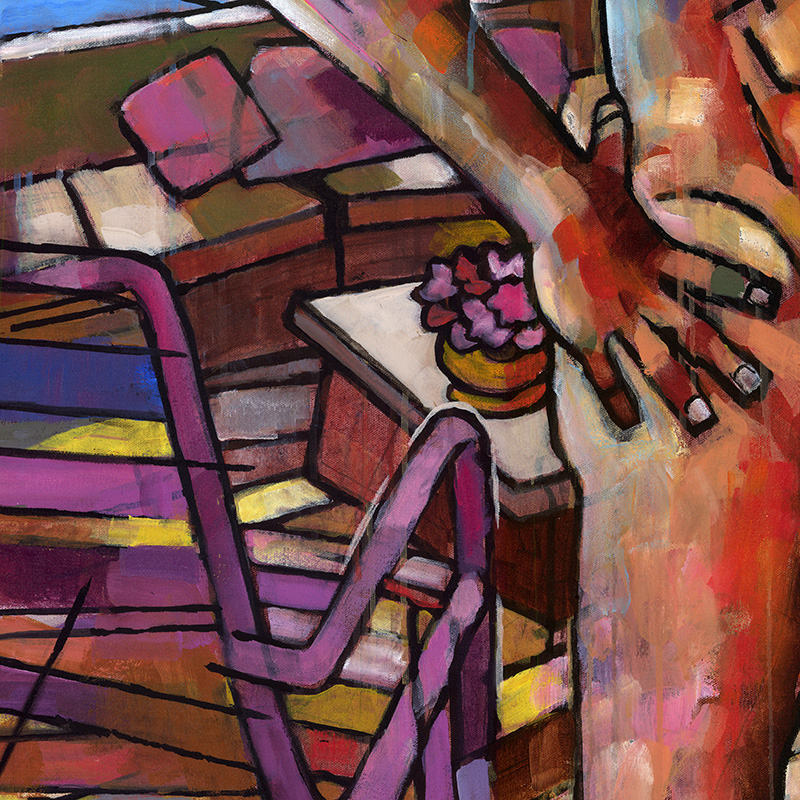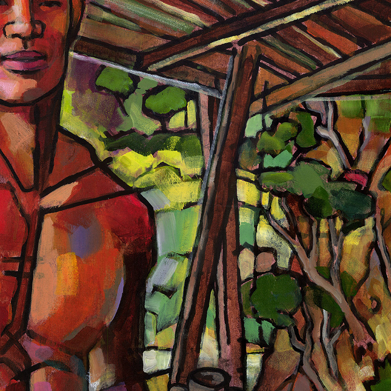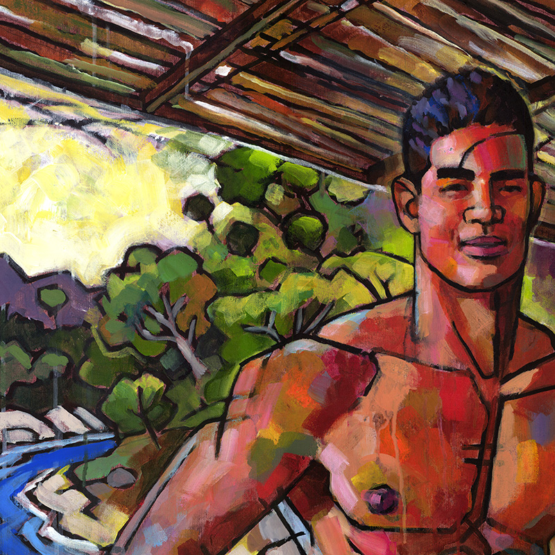 Brazilian male nude standing on veranda overlooking lush riverside.