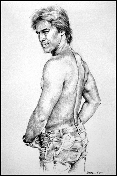 Side/rear, no shirt, holey jeans, direct gaze