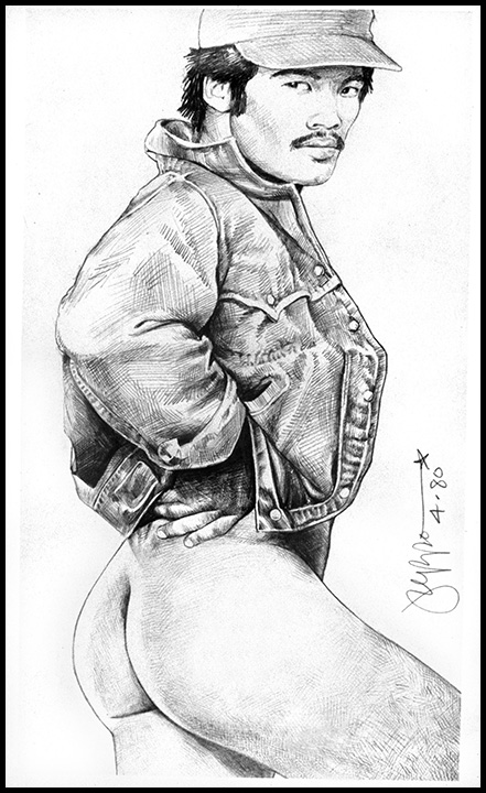 Asian male in levi jacket, nothing else, from rear (I used a photo in a gay skin magazine as a reference, and made him Asian) (I used my nickname Peppo to sign this; I wasn’t yet Douglas Simonson!)