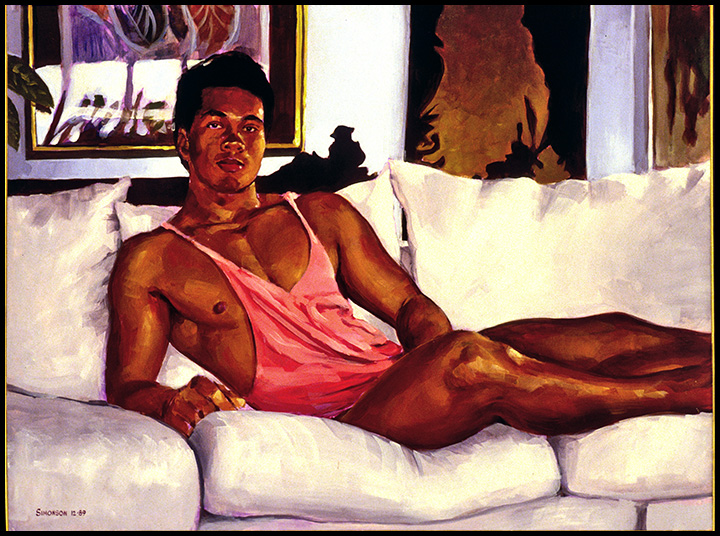 Bodybuilder in tanktop stretches on sofa