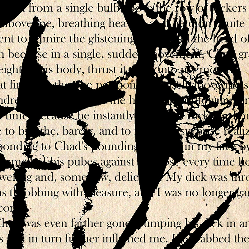Frontal standing nude of Asian bodybuilder overlaid on text from vintage gay erotica.