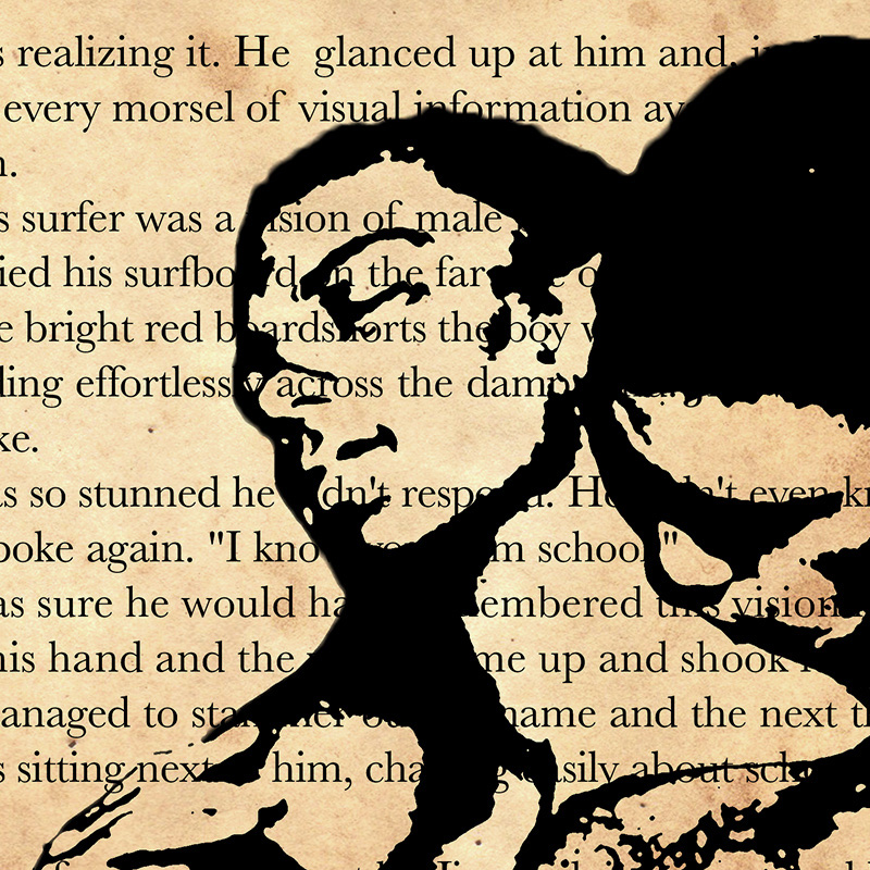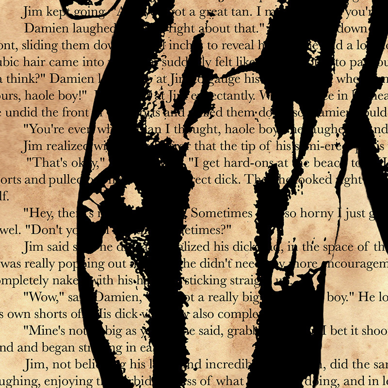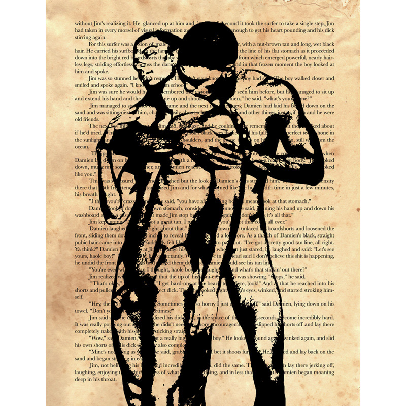 Nude embracing male couple, overlaid on text from vintage gay novel.