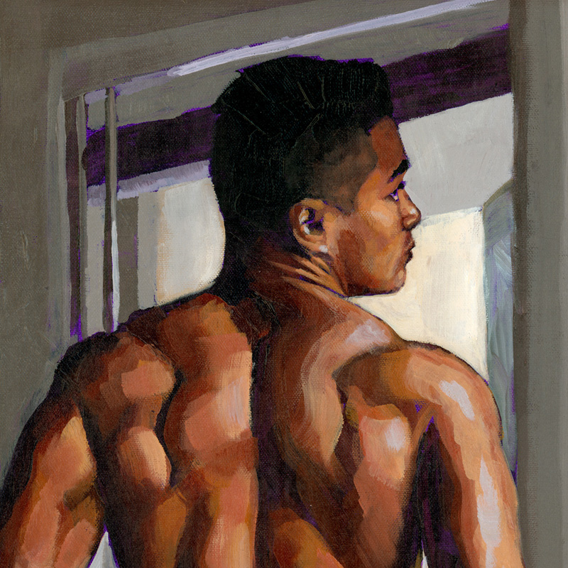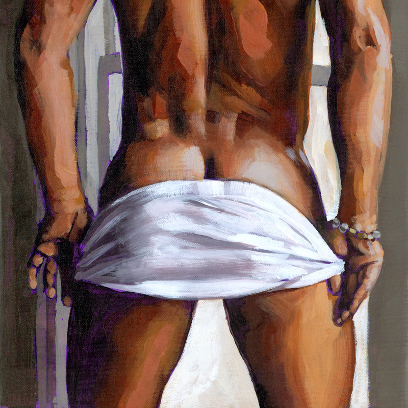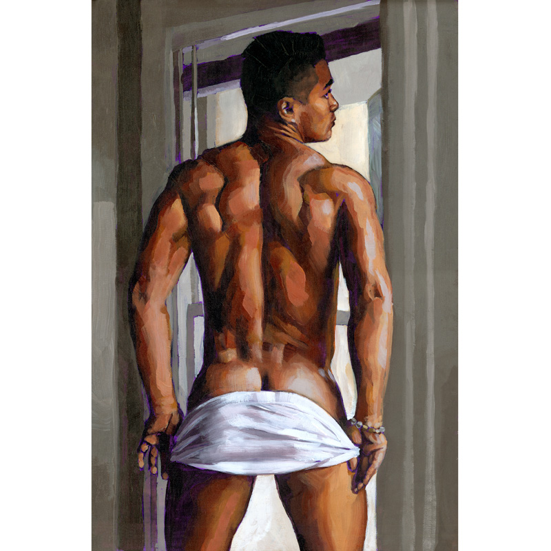 Rear view, muscular Latin male lowering briefs.