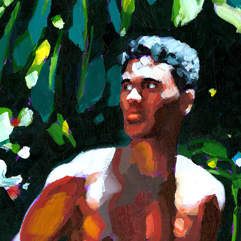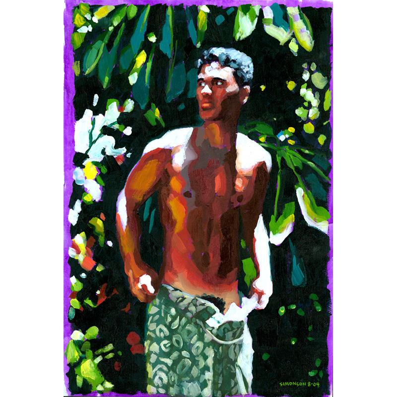 Hawaiian boy in jungle setting, lowering shorts.