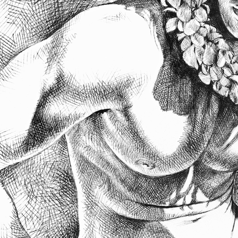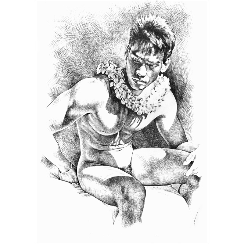 Handsome Thai boy sits nude in Hawaiian sunlight, wearing only a flower lei .