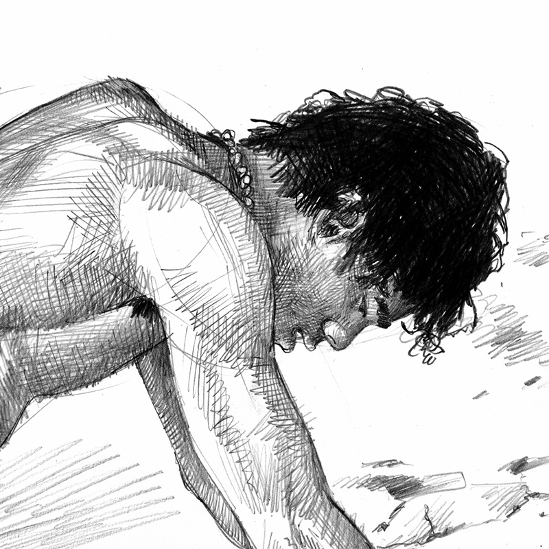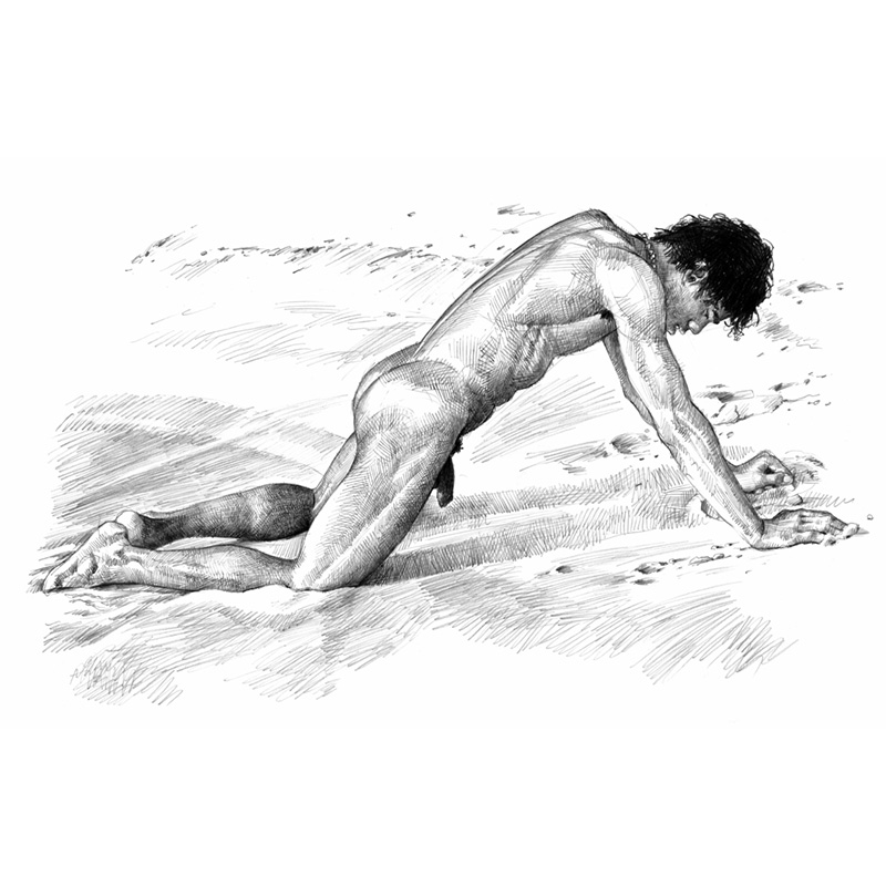Bedraggled nude male crawling out of ocean.
