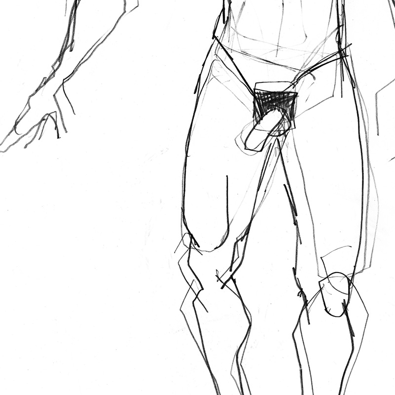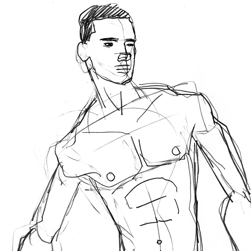 Loosely drawn standing frontal male nude with one arm extended.