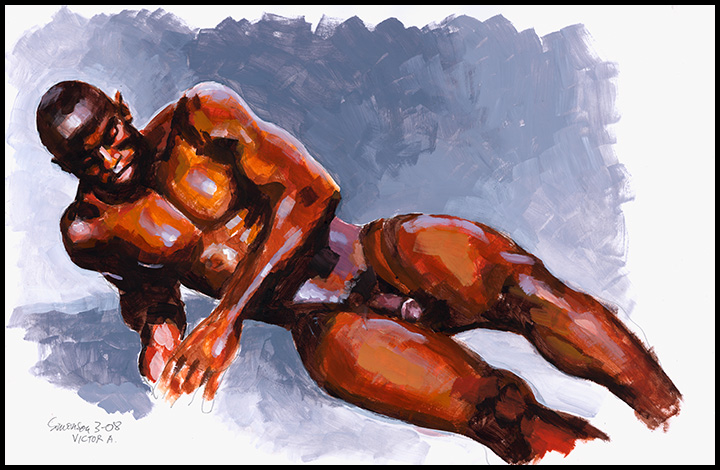 Reclining muscular black man on grey backgrd