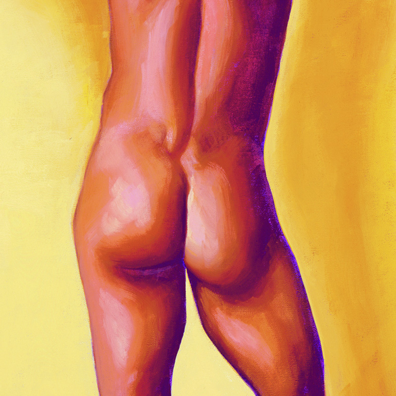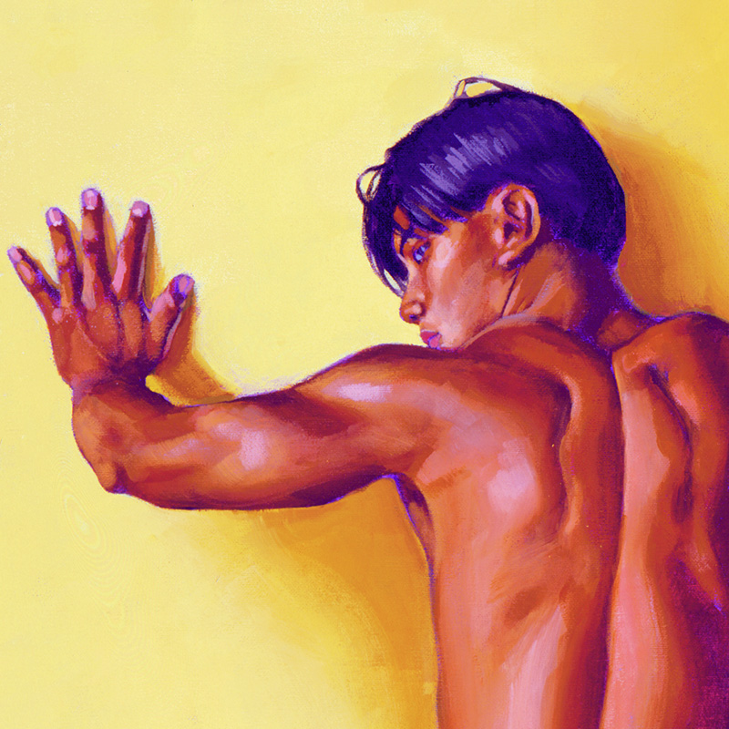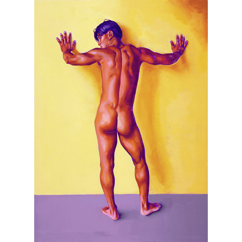 Full-length musc.Asian rear nude leaning on wall.