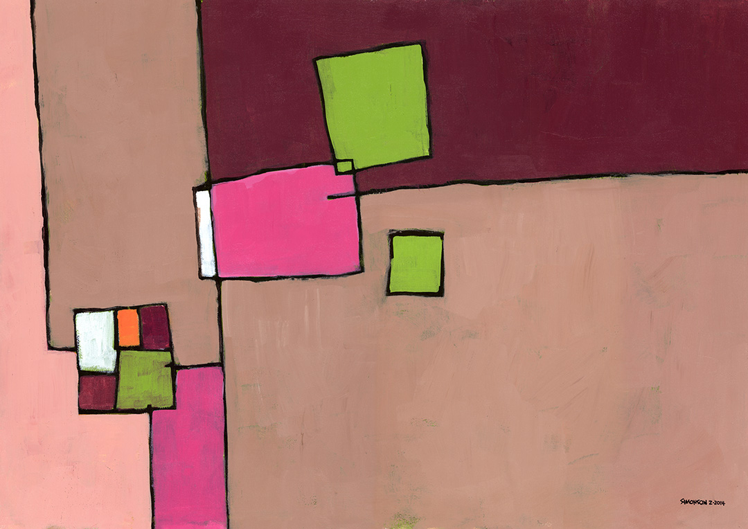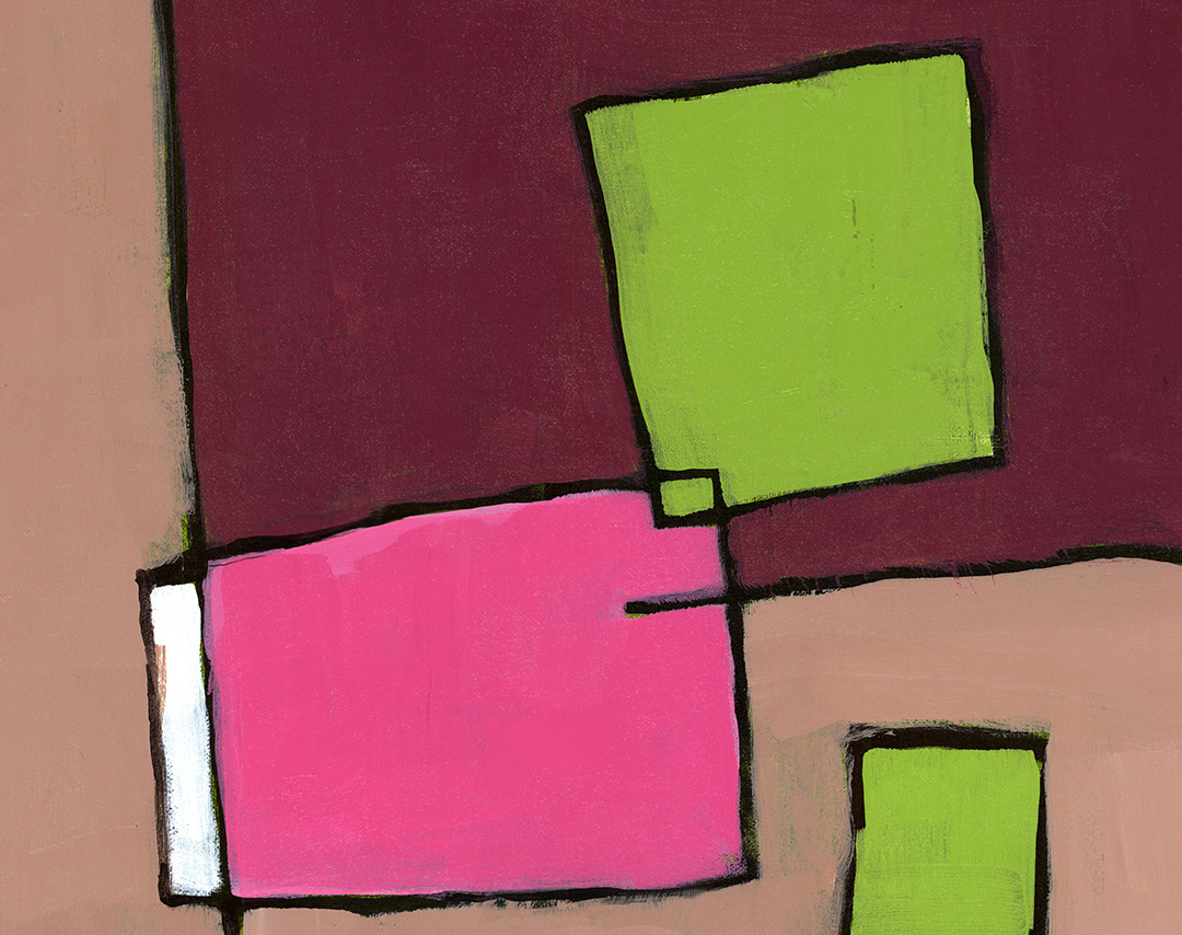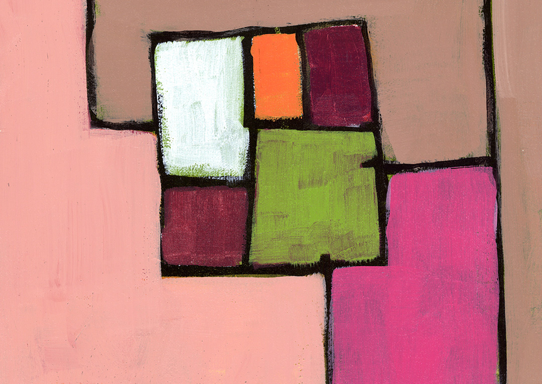 Whimsical horizontal abstract with black lines surrounding blocks of color.