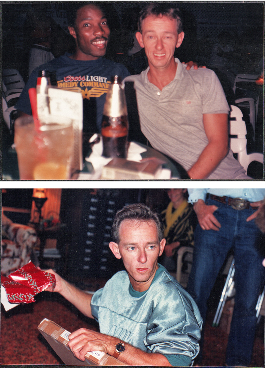 1988: Top, with my friend Bruce S. at Hula’s; Bottom, opening Christmas present in Nebraska.